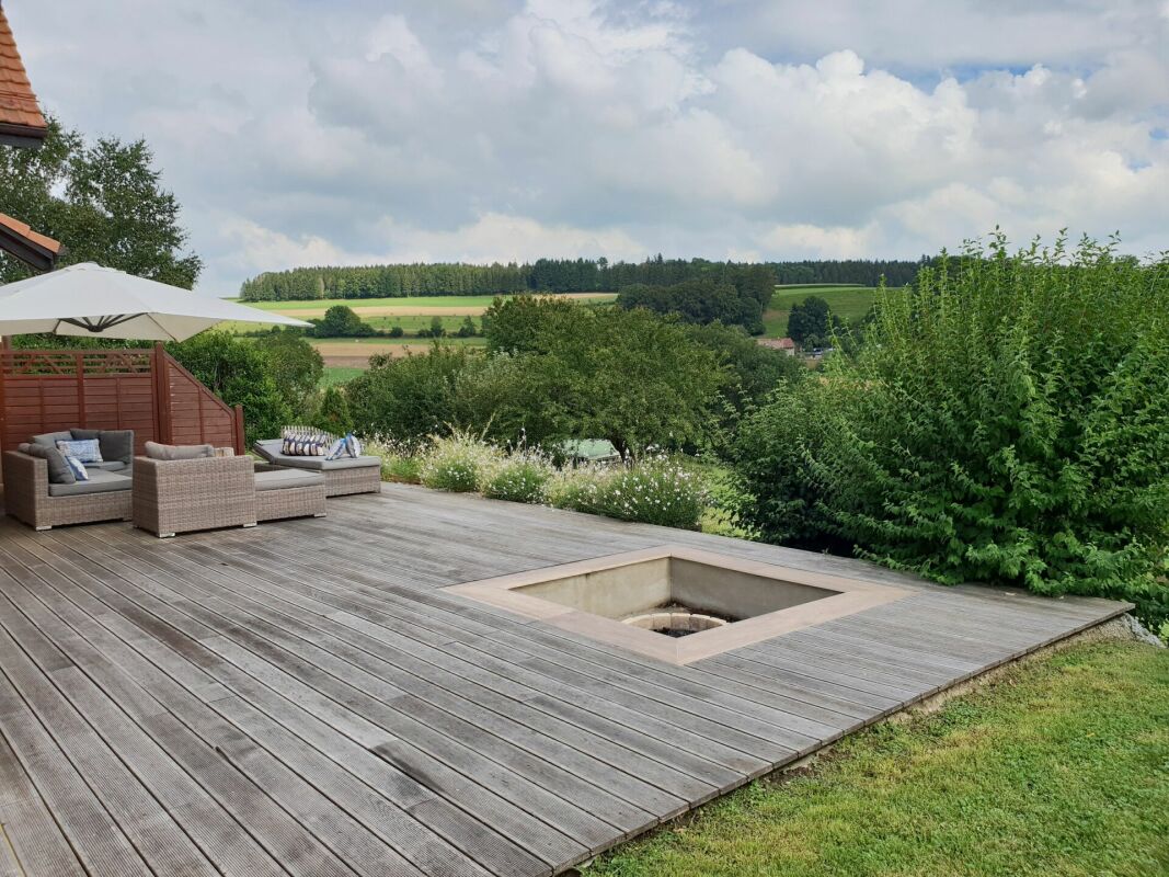 Terrasse en bois avec cheminée intégrée + une piscine