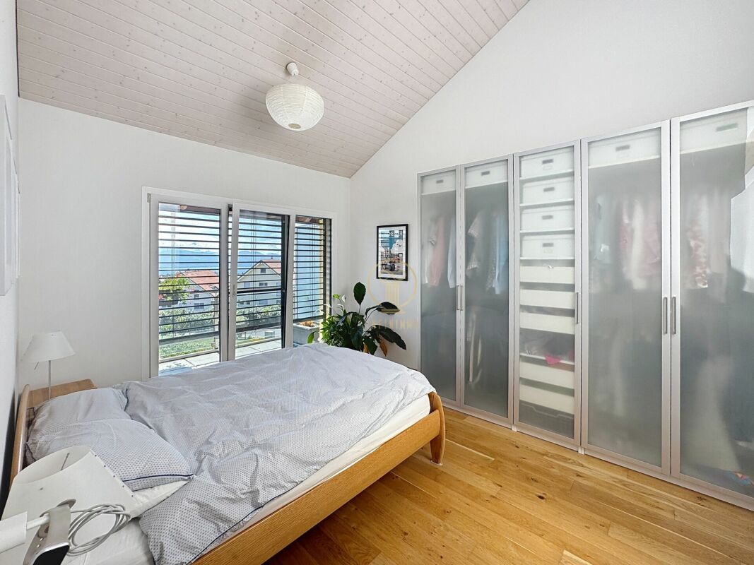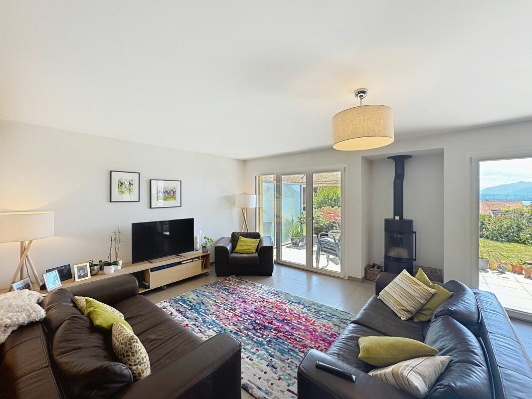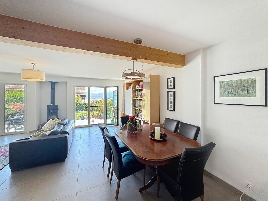 Spacieux séjour lumineux avec poêle à bois, Cuisine ouverte entièrement équipée, Accès direct à une terrasse et à un jardin privatif offrant une belle vue sur le lac et les Alpes.